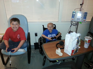 Brody had a CT scan early this morning and is getting his chemo right now. We got good news on the CT scan today. The tumor did not get any larger since the last scan 3 weeks ago. The tumor is the same size as the last scan. I would, of course, prefer it had gotten smaller but not getting bigger is wonderful news too. The new chemo regimen appears to be at least stabilizing things. His CT scan results are being sent to Cincinnati Children's for review also. Our oncologist emailed the oncologist we have been consulting with at Cincinnati Children's to let him know the scans are being sent and that he wants the tumor board to review them and strive to schedule Brody for surgery to remove as much of the tumor as possible in 3 to 4 weeks. This will be a MAJOR surgery as Brody's tumor is very large with major organ and vascular involvement and is still within his spinal column. His bowels will also need to be moved away from the residential area of his tumor. It will be held away from this area with mesh. This will allow radiation treatments to the area after the tumor is removed. Intestines cannot handle very much radiation. Moving them away from the treatment area will allow Brody to receive this additional treatment. Otherwise he could not receive more radiation treatments to this area as he has already received the max he can without moving his intestines over.